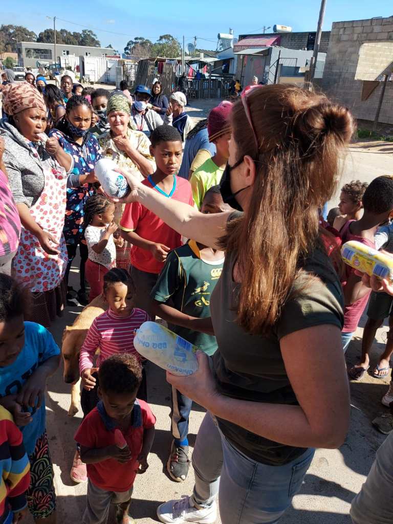 Wij mochten beginnen met het uitdelen van honderden waterijsjes. Sommige kinderen kwamen voor ons gevoel vijf keer voorbij en ook diverse volwassen vrouwen stonden ineens vooraan. Het voelde bijna ordinair om die volwassen personen “thank you” te horen zeggen als ze van ons zo’n ijsje in de handen kregen gedrukt. Toen de eerste kratten leeg waren schakelden we over op het verstrekken van ontelbare keihard ingevroren ‘baloney rollen’…….dat zijn een soort van worsten welke gemaakt zijn van afvalvlees. Thinus: “Ik zou het niet eten maar hier gaat het erin als zoete koek. Ze gooien het in de pan, het is prefab, zo klaar.”