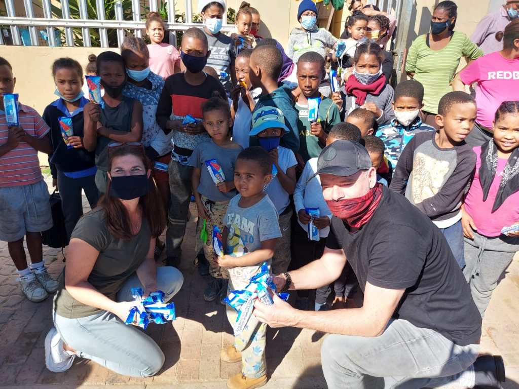 De achterdeur van de bus ging open……er kwamen een imponerend aantal plastic kratten tevoorschijn. Zo’n horecakrat waar normaal de vuile borden ingaan als de catering de barbeque spullen komt ophalen. “Marike (steevast uitgesproken als Marijke) en Willem jullie mogen uitdelen!”, riep Barbara. Al gauw kwamen uit alle hoeken en gaten hordes kinderen en volwassenen aangesneld. “Maak een rij, kids eerst”, toonde Thinus zich een ervaren volksmenner.